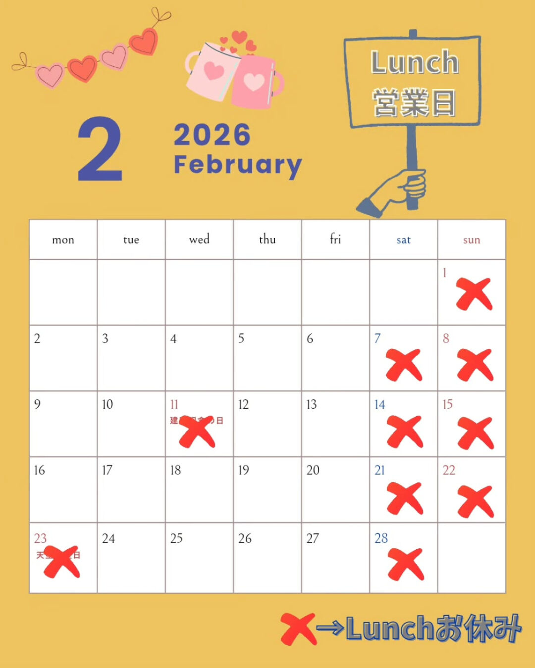 2月のLunch営業日カレンダー更新しました!